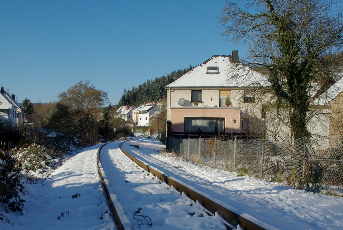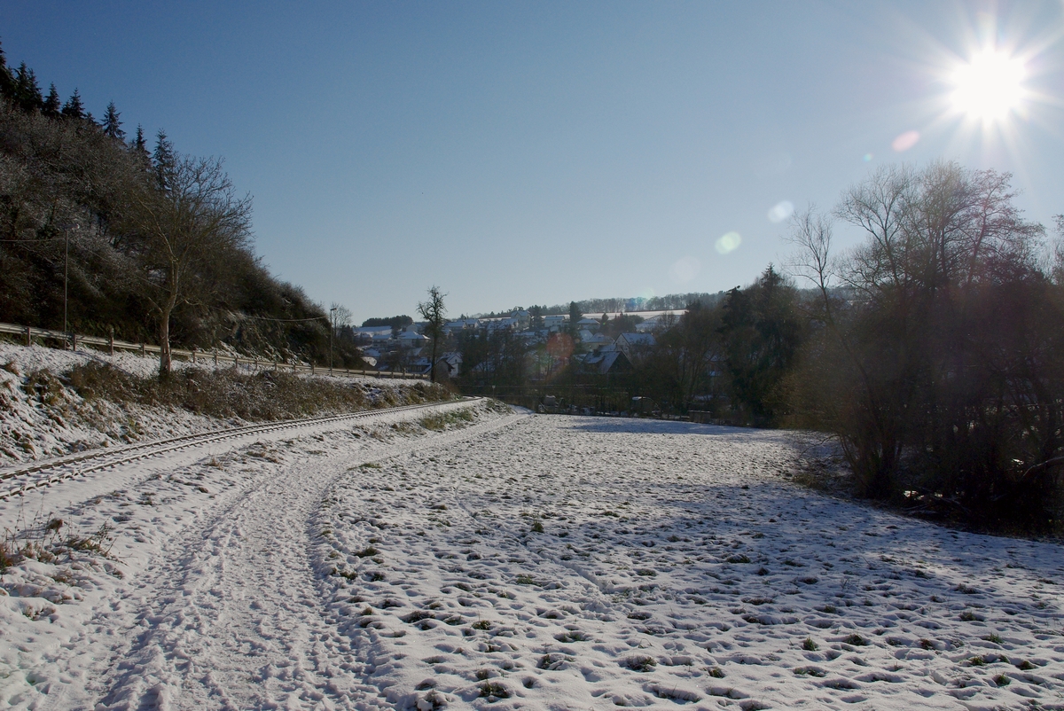 We have rented an apartment in Burgbrohl in the Vulkaneifel. Cheap and very nice. When we wake up on the first morning, it appears to have snowed that night. This is the view of the village from our front door.