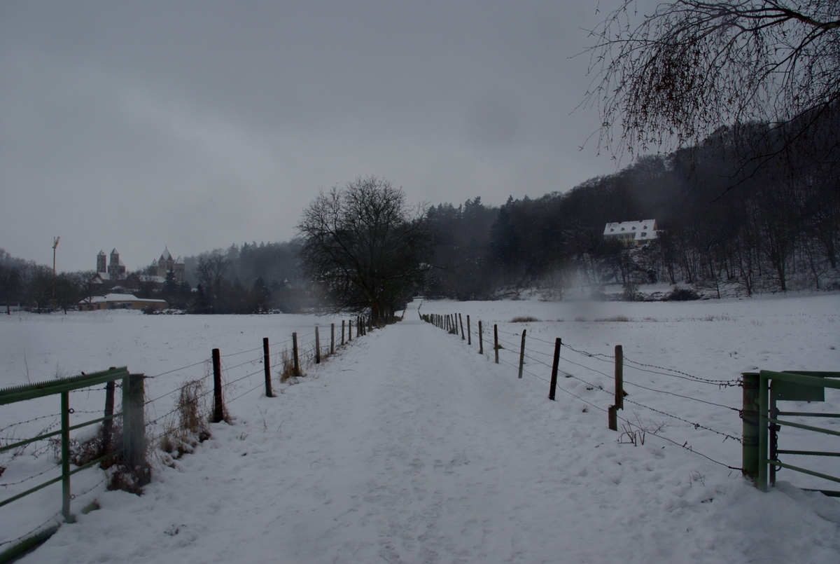 Path to the crater lake Laacher See. It's the next day and it looks like it's going to snow some more.