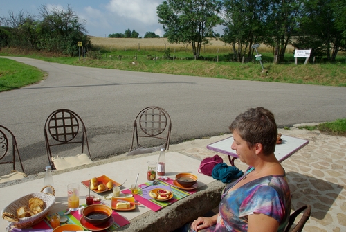 The next morning we breakfast outside, with no other guests present, along a rarely used country road.