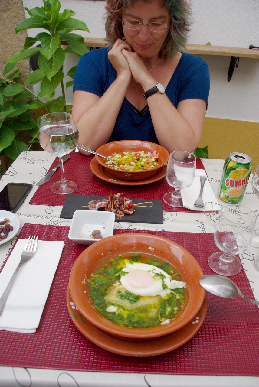Lunch on a terrace in an alley in Castelo de Vide. There is a nice and sharp tasting garlic soup with egg on my plate.