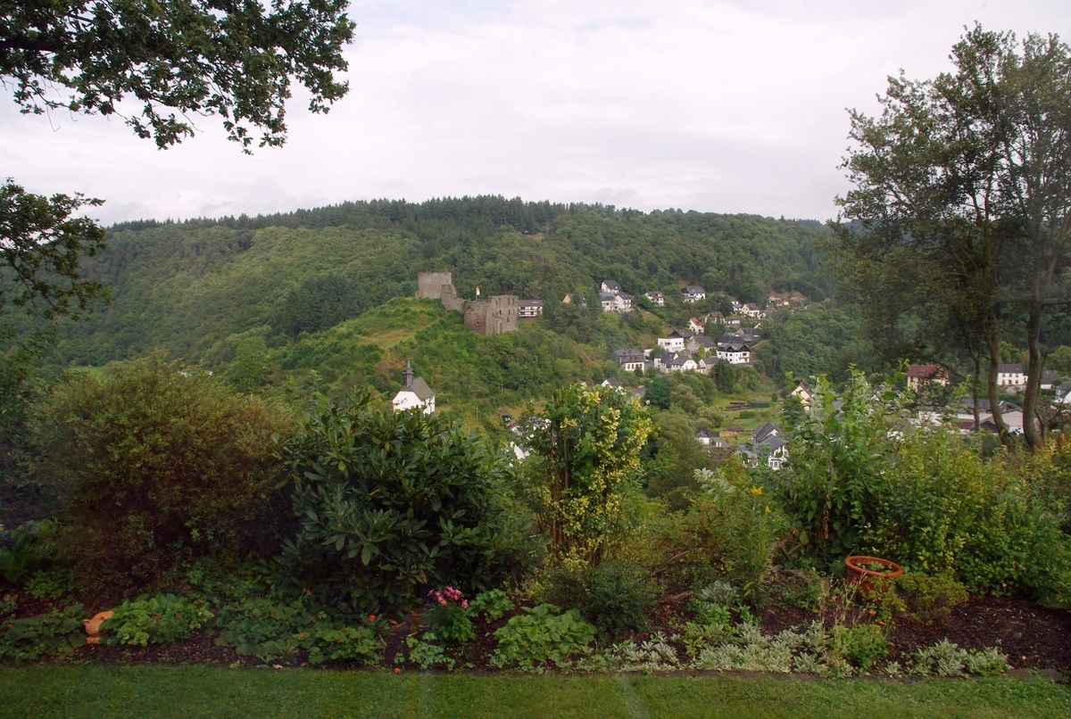 The view from our room in the B&B in Virneburg of the garden and the village with the castle.