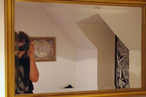 We want to go to Harris, but when we arrive in the harbour town Uig in the north of Skye, it appears the boat has already left. Too bad. We phone our B&B on Harris, and we decide to stay the night in Uig and to leave for Harris the next morning. We manage to find a nice B&B (Drumaine) and a nice restaurant (Ferry Inn). The cook at the Ferry Inn (later our B&B-owner Joy will tell us that he used to be a roadie for The Who) is entertaining and tells us what we might want to go and see on Skye. Joy of B&B Drumaine is from New Mexico and is married to an Englishman whom she met when she was living in Japan for ten years. We get to pick our room ourselves. The door of the house will not be locked. There is no criminality here (well, apart from that one lady who recently managed to steal 10.000 pounds from the post office). I took this photo in the mirror of our room in Drumaine in Uig.
