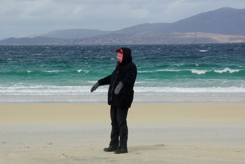 Laura is leaning in the wind on the beach of Luskentyre. Harris has a lot of these beautiful sandy beaches. But the rough winds make the beaches freezing cold.