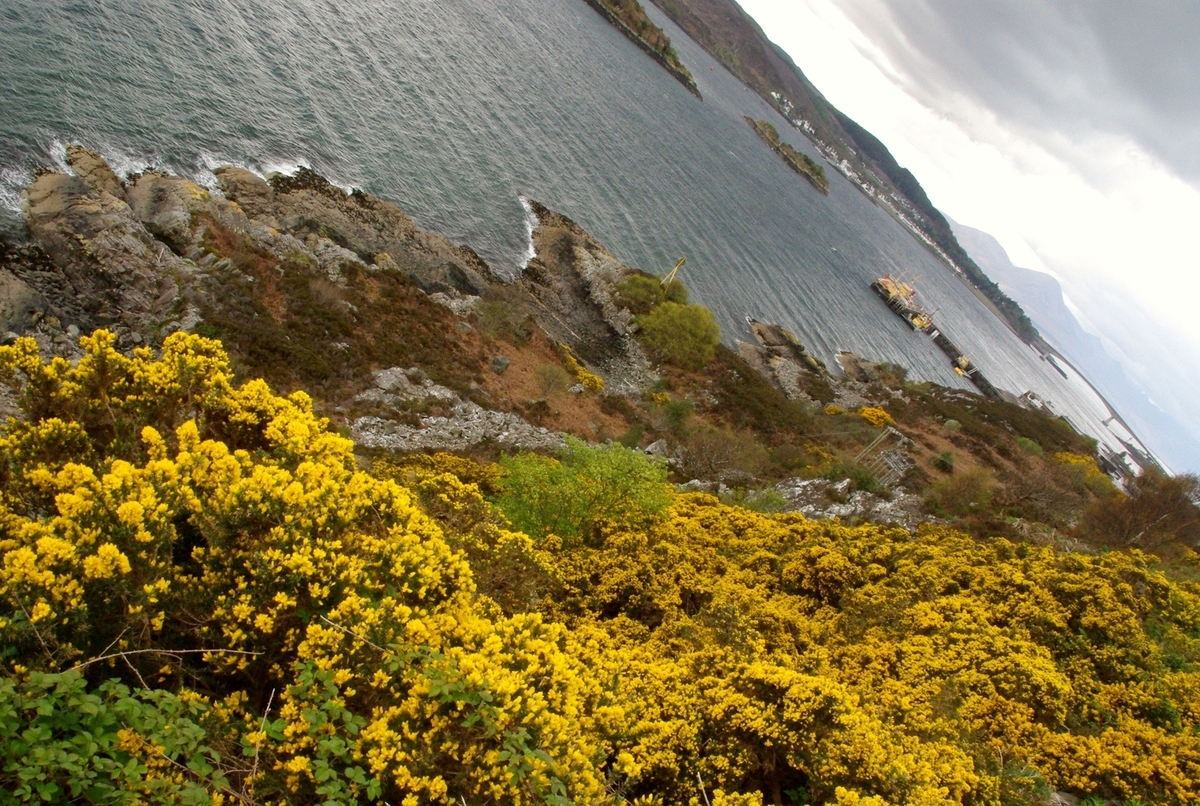 Lots of broom and on the right a view of the (very high) bridge to Skye.